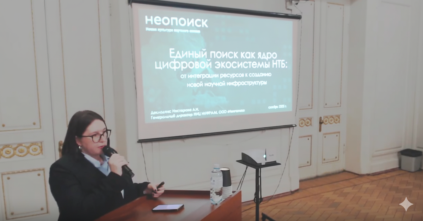 В своем докладе «Единый поиск как ядро цифровой экосистемы НТБ: от интеграции ресурсов к созданию новой научной инфраструктуры» Альбина Николаевна обозначила ключевые вызовы, с которыми сегодня сталкиваются вузовские НТБ, и представила практическое решение на примере сервиса научного поиска Неопоиск.