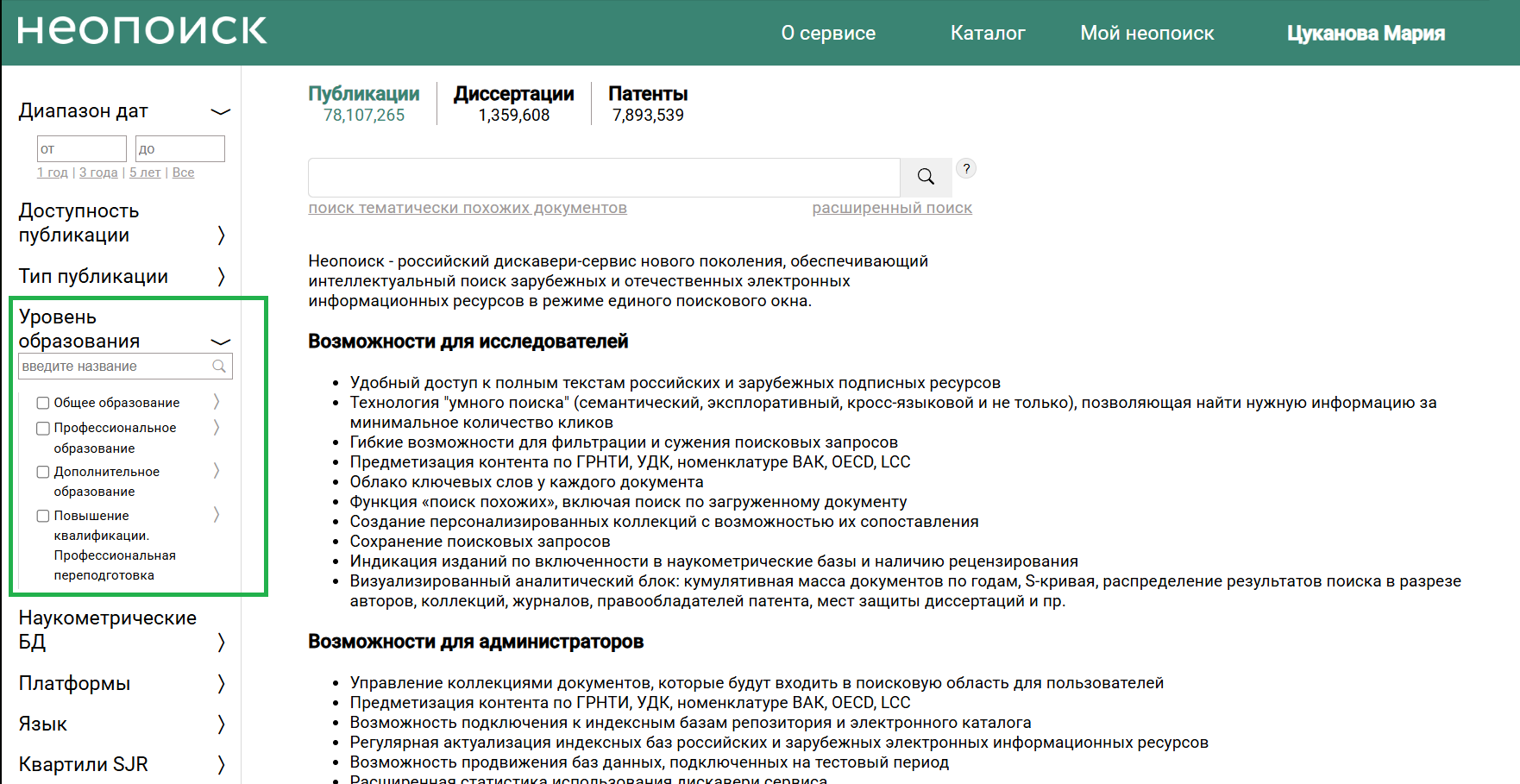 Чтобы помочь вам точнее подбирать материалы для конкретных образовательных задач, мы добавили в меню фильтр «Уровень образования». Он находится под блоком «Тип публикации» и позволяет сегментировать результаты для общего, профессионального, дополнительного образования, повышения квалификации и профпереподготовки. Преподаватели смогут быстрее формировать списки литературы для учебных планов, а студенты и аспиранты — находить контент, соответствующий их уровню подготовки, отделяя базовые учебные пособия от узкоспециализированных научных монографий.