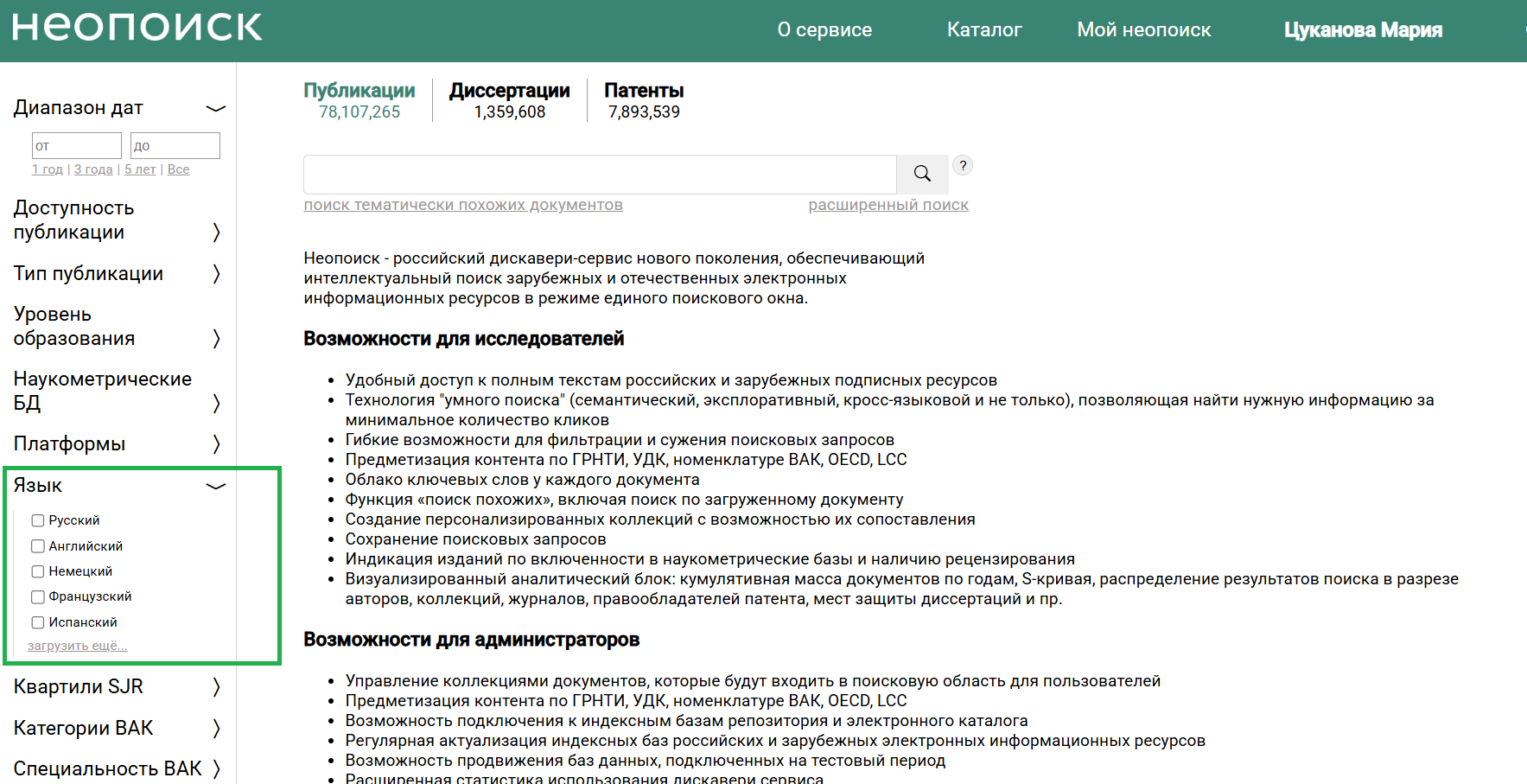 Для любого исследователя, работающего с международными научными документами, важна возможность быстро разграничить источники по языку. Мы перенесли фильтр «Язык» из расширенного поиска прямо в основное меню, расположив его сразу после блока «Платформы». Теперь вы можете одним кликом отобрать публикации на русском, английском, немецком или любом другом языке. Значения в фильтре отсортированы по убыванию популярности, что позволяет моментально находить самые востребованные языковые группы. Это нововведение сокращает время на подготовку обзоров литературы и поиск первоисточников на языке оригинала.
